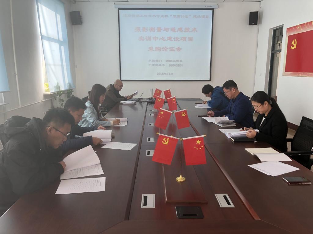 2018年11月2日上午9.00,测绘系在四楼会议室召开“辽宁省高水平现代化高职院校项目建设”的子项目“摄影测量与遥感技术实训中心”专家论证 会。建工系副主任李宁、道桥系王高级工程师王立争、测绘系书记张哲、主任杨学锋、副书记朱永、副主任马驰、张慧慧对项目建设实施方案进行了论 证。论证会由杨学锋主任主持。