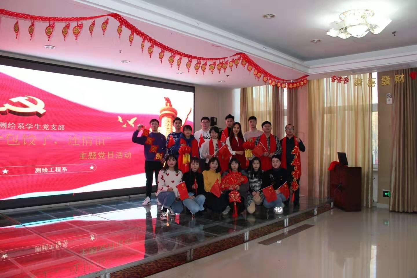 为了深入践行党的十九届四中全会精神,推进“不忘初心,牢记使命”主题教育,增强广大党员服务意识,2019年12月31日下午,测绘系学生党支部在培训中心一楼举行“包饺子,连情谊”主题党日活动,为贫困生送去温暖与关心。测绘系党总支书记张哲、党总支副书记朱永、学生党支部全体师生党员、大一贫困生代表共60余人参加了党日活动。