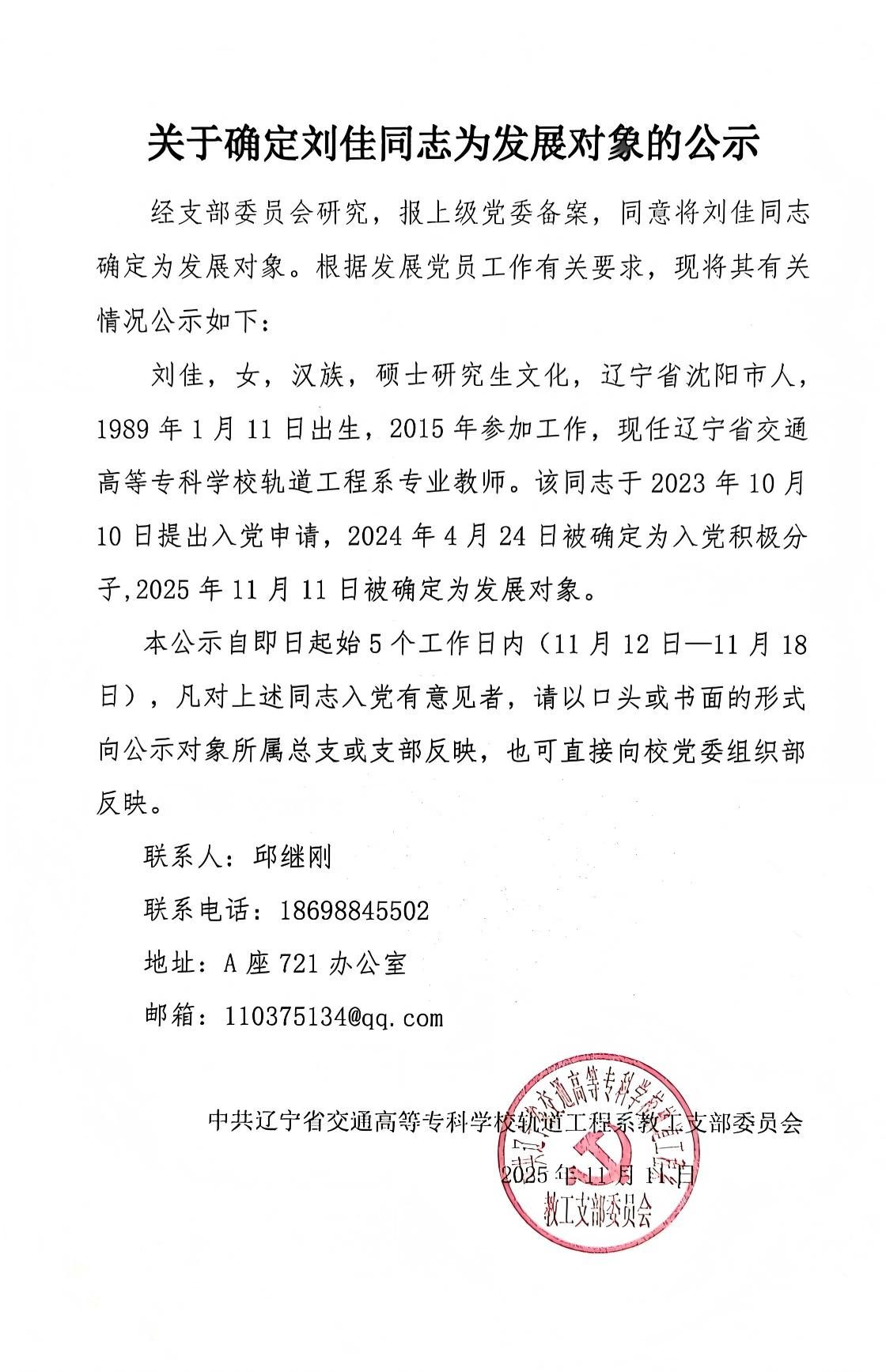 经支部委员会研究,报上级党委备案,同意将刘佳同志确定为发展对象。根据发展党员工作有关要求。现将其有关情况公示如下:
