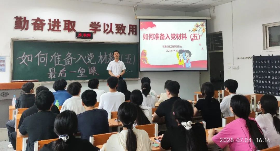 轨道工程系于2025年7月4日在C105举办了主题为“如何准备入党材料(五)”的专题党课。本次党课由轨道工程系专职组织员孔繁军主讲,轨道工程系67、68、69期入党积极分子参加。
