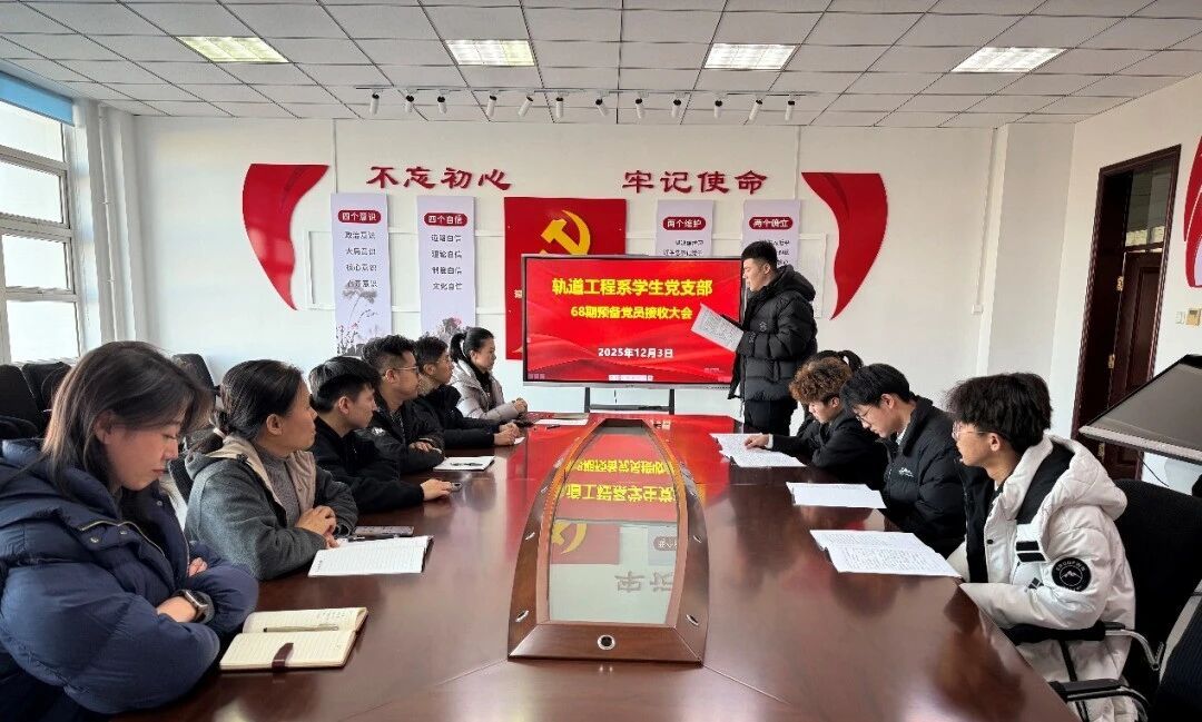 为扎实做好党员发展工作,进一步加强基层党组织建设,2025年12月3日,轨道工程系学生党支部在A712召开预备党员接收大会,讨论并表决关于接收董久泽等5名发展对象为中共预备党员的事宜。轨道系党总支副书记边境、支部全体正式党员、入党介绍人及5名发展对象参加会议。本次会议由支部书记杨丽主持。
