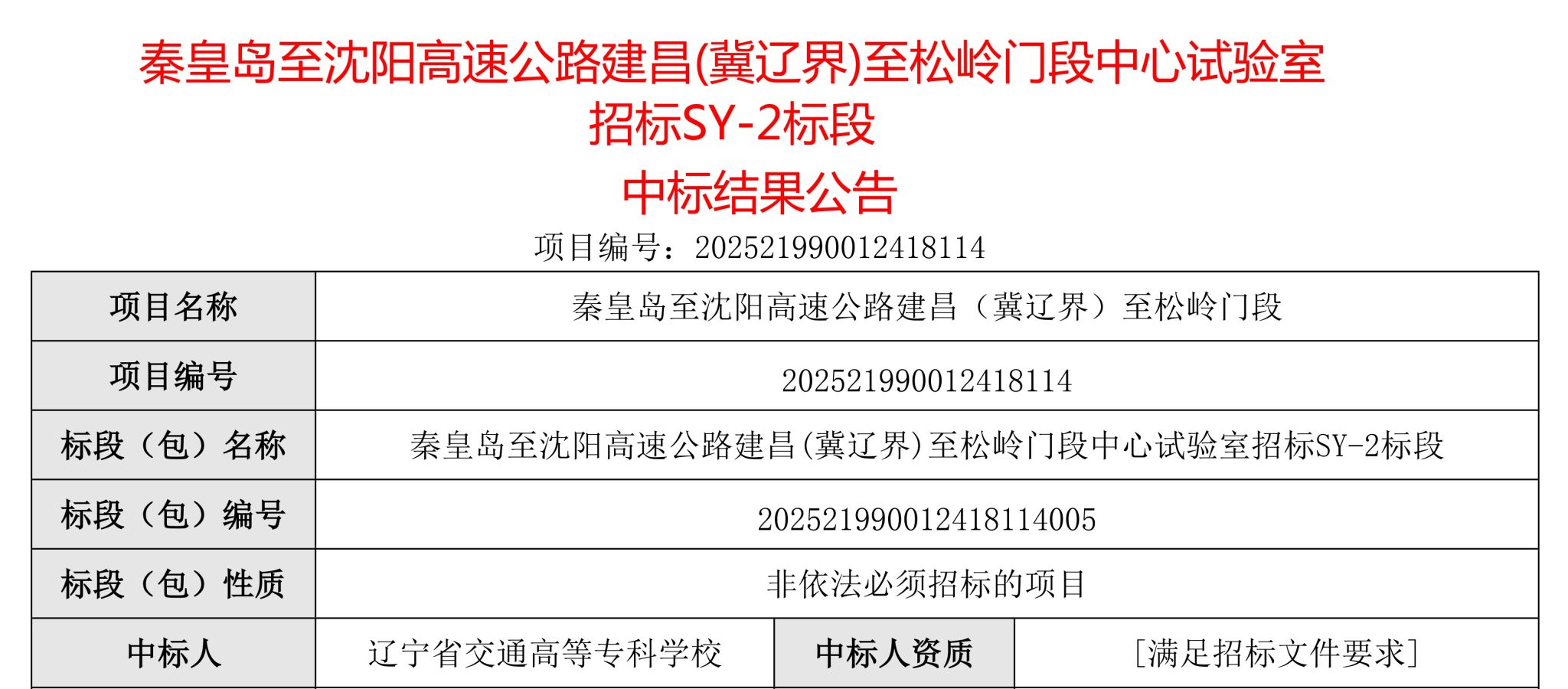 12月15日,我校检测实验中心凭借雄厚的技术实力与良好的行业信誉,成功中标辽宁省交通运输厅“秦皇岛至沈阳高速公路建昌(冀辽界)至松岭门段中心试验室项目”,承担该项目SY-2标段中心试验室的工作任务。