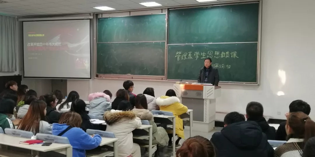为全面加强大学生思想政治教育,我系于2018年11月19日下午,系总支书记富浩在b座阶一,以“改革开放四十年伟大成就——见证中国共产党的正确领导”为题,为管理工程系学生会及各班班长和团支书上思想政治理论课。