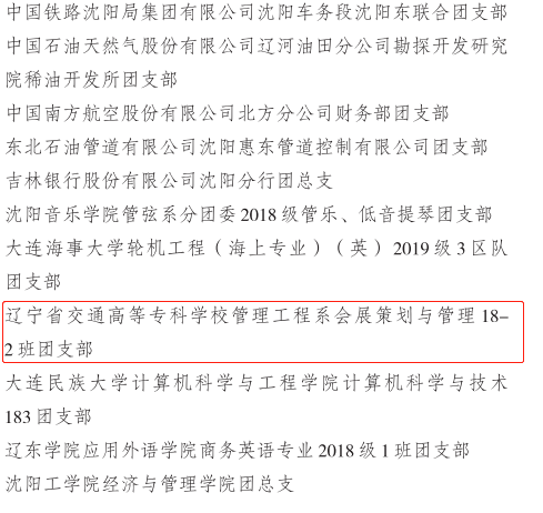 近日,共青团辽宁省委员会公布《关于表彰2020年度“辽宁省五四红旗团委”“辽宁省先进团委”“辽宁省五四红旗团支部”“辽宁省优秀共青团干部”“辽宁省优秀共青团员”的决定》(辽团发【2021】7号),表彰2020年度表现突出的团组织、团干部和广大团员。全省共有14所本、专科高校团委、8所高校基层团支部位列其中。我系会展策划与管理专业18-2团支部荣获“辽宁省五四红旗团支部”荣誉称号。