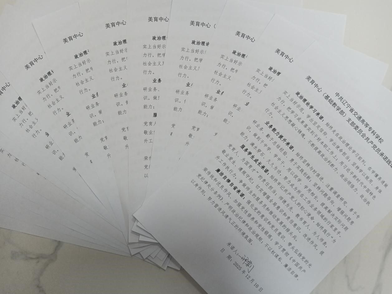 接着,美育中心(基础教学部)党支部全体共产党员签订了《共产党员承诺践诺书》,向党组织、向全校师生许下自己庄严的承诺:用习近平新时代中国特色社会主义思想凝心铸魂,始终牢记共产党人的初心使命、始终践行为党育人、为国育才的责任担当,争做理论学习示范、争做教书育人模范、争做业务行家里手、绷紧廉洁自律之弦。