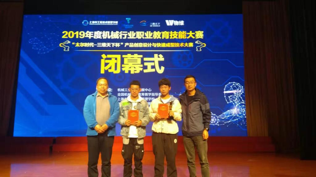 2019年11月13日至17日,由机械工业教育发展中心、全国机械职业教育教学指导委员会主办的“2019年度机械行业职业教育技能大赛 ‘太尔时代--三维天下杯’产品创意设计与快速成型技术赛项”在上海市工程技术管理学校隆重举行。来自全国56所院校的79支队伍参加了比赛,经过激励的角逐,其中有5支队伍获得一等奖,我校孙翀翔领队,高显宏,赵萍任指导教师,代僮一,张鹤松组队,夺得比赛团队一等奖,高显宏,赵萍获得大赛执委会颁发的优秀指导教师奖。
