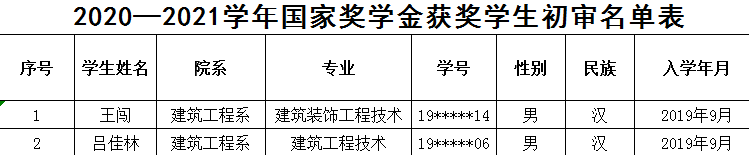2020-2021学年度高等学校国家奖学金获奖学生初审名单公示
