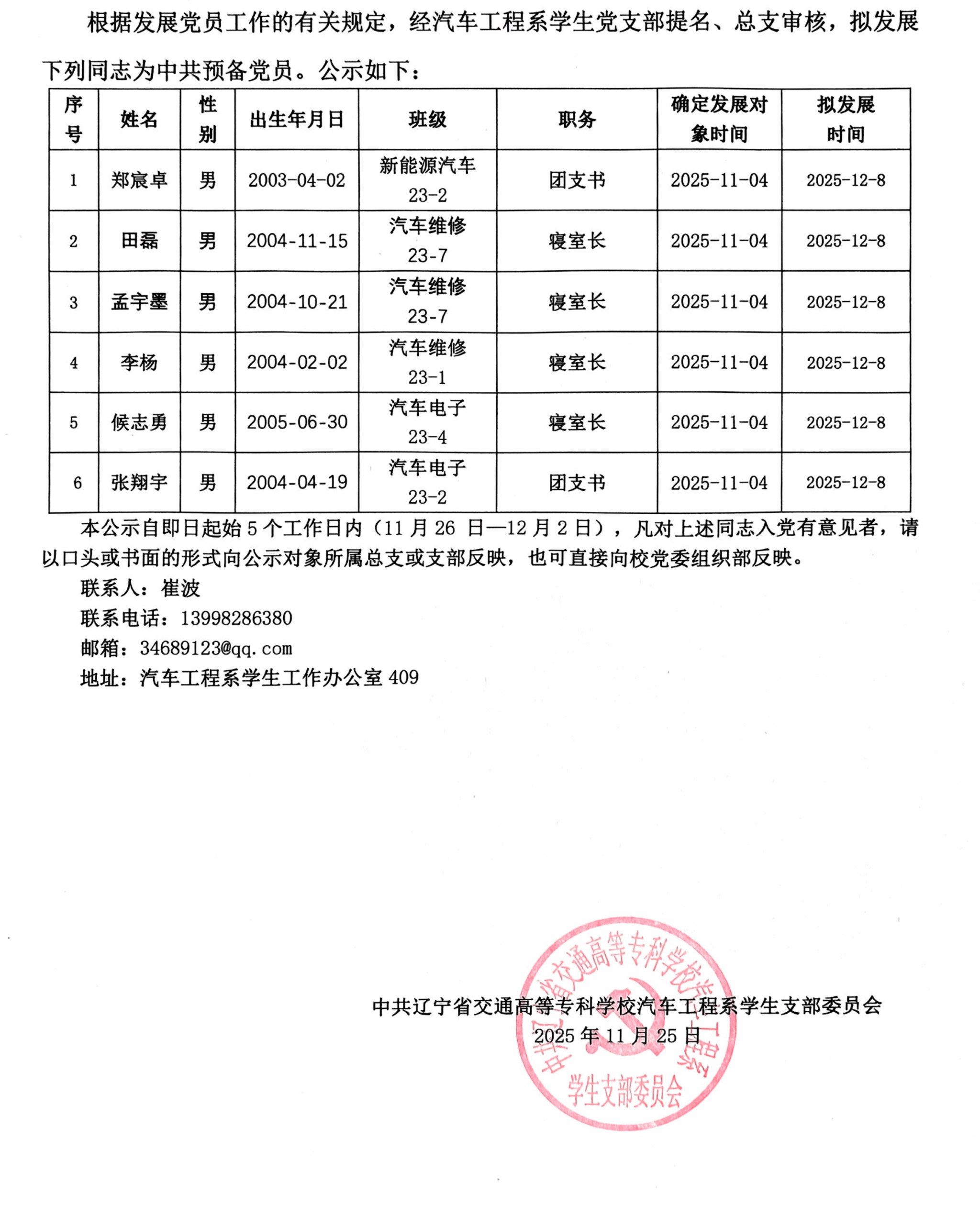 关于拟将郑宸卓等6名同志接收为中共预备党员的公示