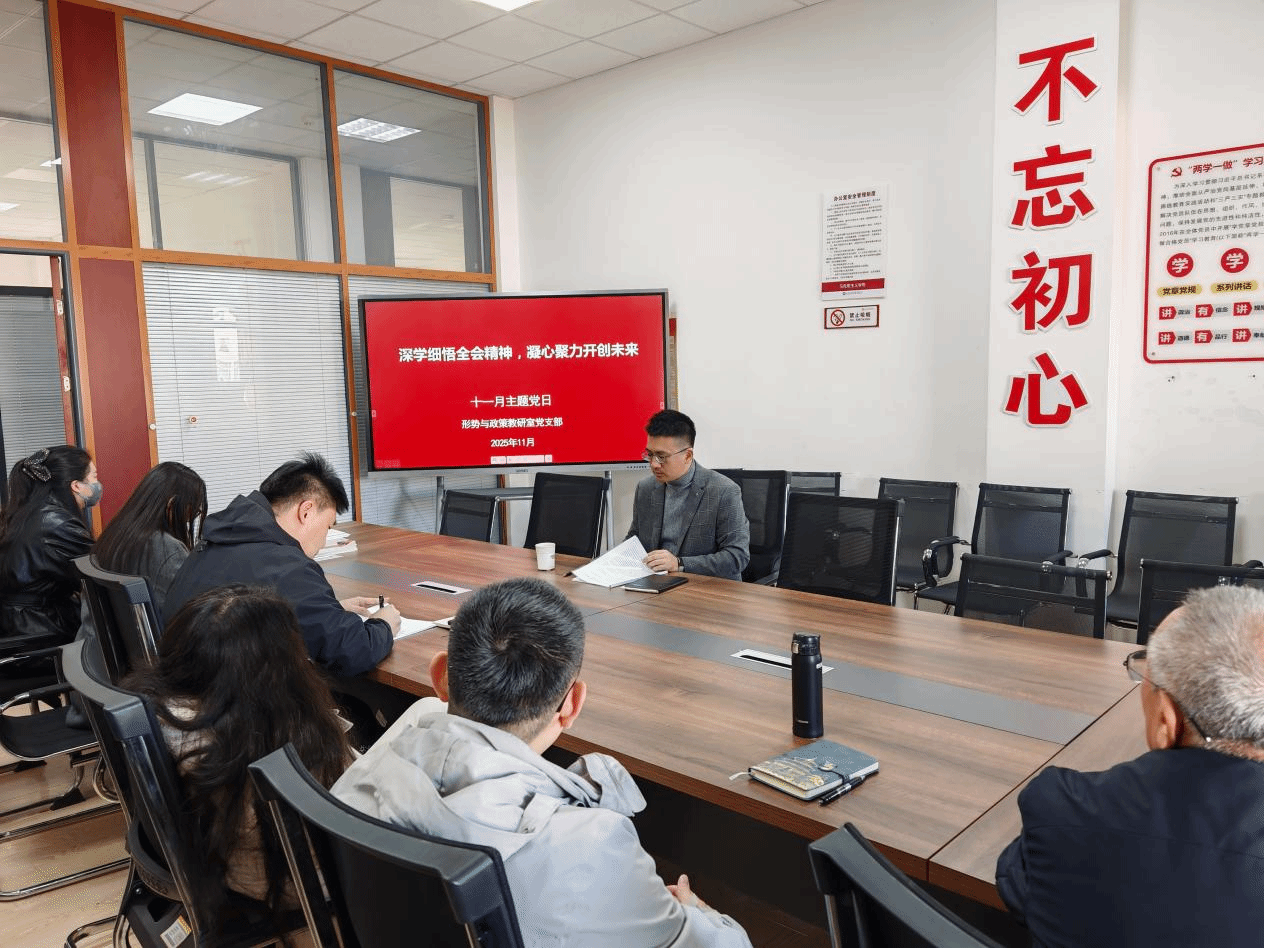 形势与政策教研室党支部学习贯彻党的二十届四中全会精神,准确把握“十五五”时期党和国家事业发展的历史方位,深入分析发展环境的深刻复杂变化,引导广大党员切实将思想和行动统一到习近平总书记重要讲话精神和党中央决策部署上来,将全会精神融入课程教学,打造思政课堂主阵地。党支部以“深学细悟全会精神,凝心聚力开创未来”为主题,召开党支部会议,重点解读全会提出的历史方位判断、“十五五“时期六个“坚持“原则及战略重点部署。通过深入研讨和集体备课,党员教师结合全会提出的重点任务,精心设计教学内容,将国家发展蓝图与学生个人成长紧密结合,引导青年学子树立正确的世界观、人生观和价值观,切实发挥思政课铸魂育人的关键作用。