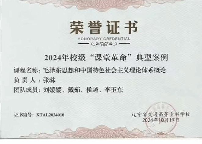 《毛泽东思想和中国特色社会主义理论体系概论》课程以马克思主义为指导,不断融入党的创新理论,立足交通行业、结合工科职业院校“德技并修”的人才培养要求,以校本化的人文、历史、红色主题教育及行业案例融入课程教学,通过史论结合、数智结合、理论实践相结合的方式活化对马克思中国化时代化的理论逻辑、历史逻辑和实践逻辑的理解,让学生在回顾中国共产党领导的革命、建设、改革的历史进程中感受历史成就,深化对马克思主义理论“两个结合”的认识,在准确把握马克思主义中国化时代化的理论成果的同时,能运用马克思主义的立场、观点和方法认识问题、分析问题和解决问题。通过理论思维能力的培养助力学生把握时代机遇,以“技能成才,技能报国”融入辽宁振兴、民族复兴的建设洪流之中,担当强国之责,铸就时代先锋。