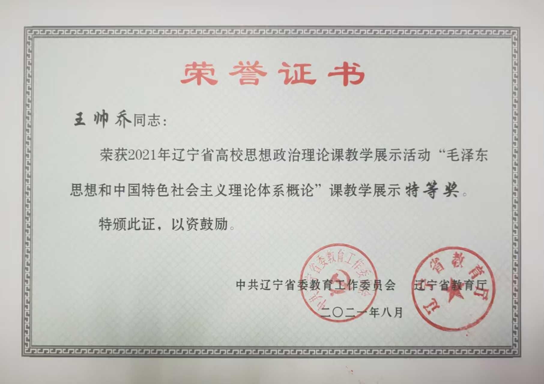 教学成果 当前位置: 首页 > 教学工作 > 教学成果 > 正文 辽宁省高校思想政治理论课教学展示活动 发布时间:2025-12-08 19:01 浏览量: 教师姓名:王帅乔项目名称(赛项全称):辽宁省高校思想政治理论课教学展示活动获奖等级:特等奖主办单位(盖章单位):中共辽宁省委教育工作委员会 辽宁省教育厅获奖日期(年月):2021年8月成果佐证: 上一条:第十四届辽宁省高校思想政治理论课教学大赛 下一条:第十四届辽宁省高校思想政治理论课教学大赛