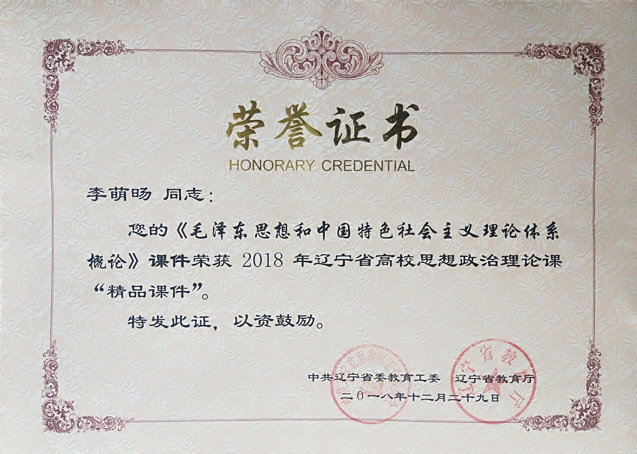 教学成果 当前位置: 首页 > 教学工作 > 教学成果 > 正文 辽宁省高校思想政治理论课“精品课件” 发布时间:2025-12-08 19:01 浏览量: 教师姓名:李萌旸项目名称(赛项全称):辽宁省高校思想政治理论课“精品课件”获奖等级:“精品课件”主办单位(盖章单位):中共辽宁省委教育工委 辽宁省教育厅获奖日期(年月):2018年12月成果佐证: 上一条:2022年度辽宁省教育系统宪法法治课教学大赛 下一条:2022年度辽宁省教育系统宪法法治课教学大赛