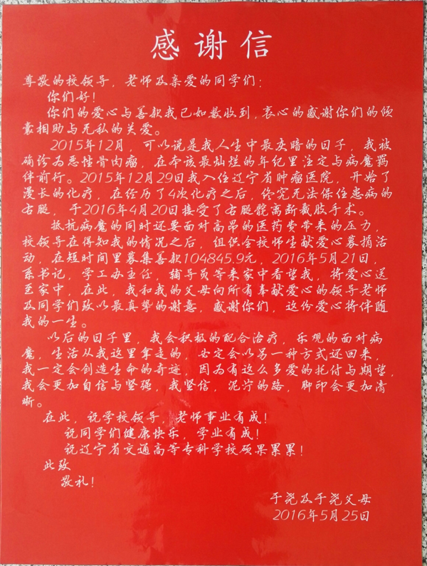 病魔无情,师生有爱——一封来自受助学生及家人的感谢信