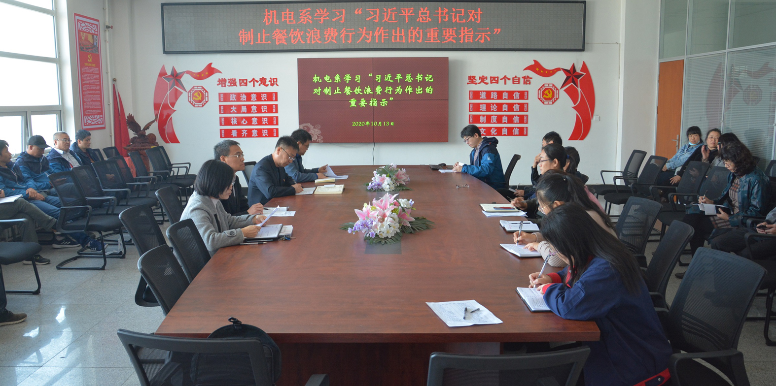根据学校统一部署,10月13日下午,机电系组织全系教职工开展集中理论学习研讨活动,学习主题为《习近平总书记教师节重要寄语精神》、《习近平关于坚决制止餐饮浪费行为的重要指示》和《习近平在全国抗击新冠肺炎疫情表彰大会上的讲话》。本次学习会议由赵波书记主持,三个学习专题分别由李东和、高洪波、赵宏立三位老师领学。赵波书记传达了学校《厉行节约反对浪费实施方案》,并要求全系教职工严格贯彻落实本《方案》。之后,...