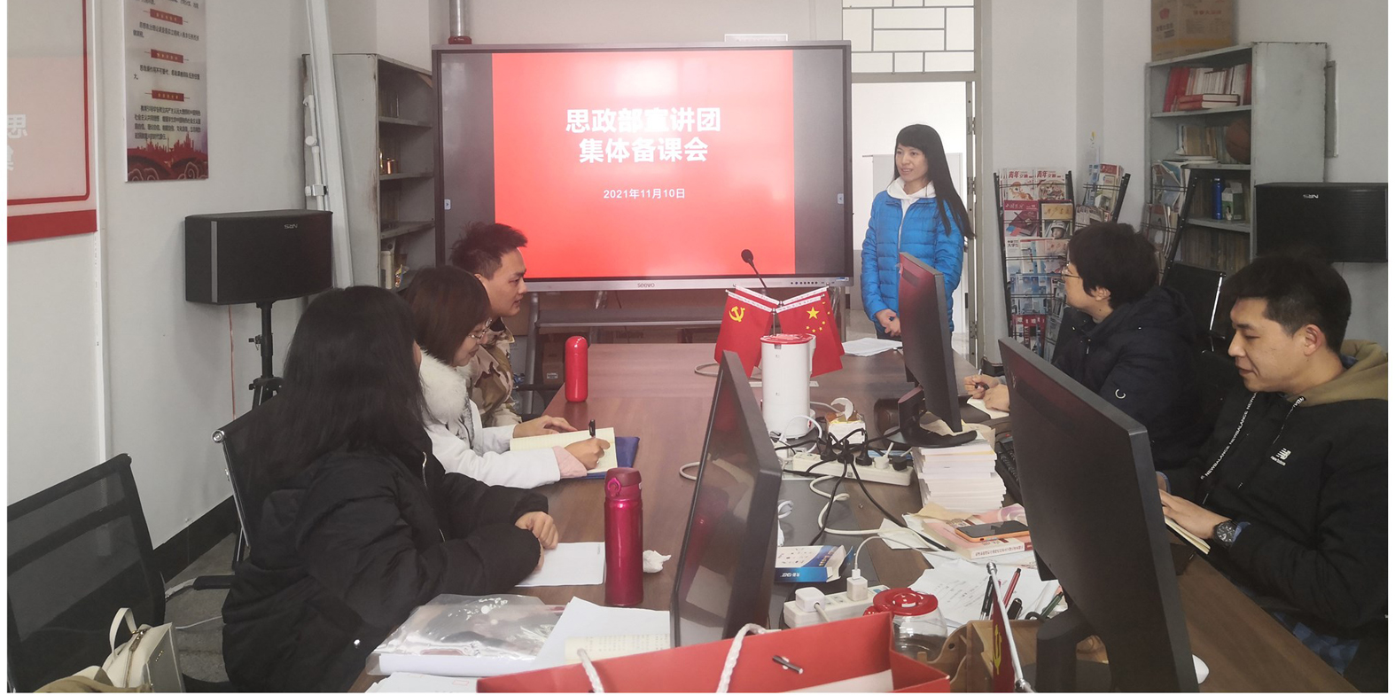 为强化理论武装,提高政治理论学习效果,推动中国特色社会主义理论体系深入教职工、深入基层,思政部教师宣讲团于11月10日中午12:40在综合实训楼601会议室召开了集体备课会。会议组织了习近平总书记“七一”重要讲话精神宣讲试讲,并为十九届六中全会宣讲进行了前期筹备。宣讲团成员李萌旸老师以《学习贯彻习近平总书记“七一”重要讲话精神》为题,从习近平总书记“七一”重要讲话精神的时代意义、主要内容及实践要求三个方面...