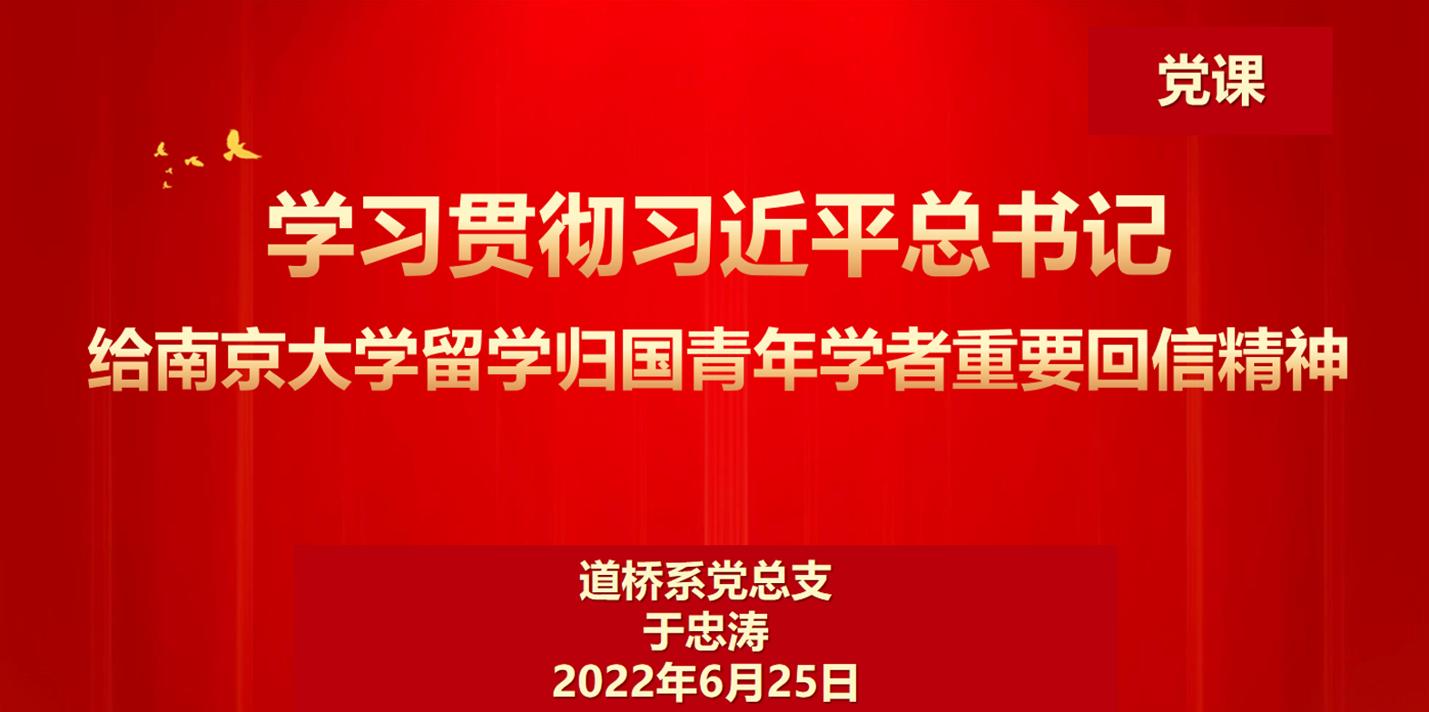 2022年6月25日,道桥系党总支以腾讯会议方式,组织全系教师集中学习贯彻习近平总书记给南京大学归国留学青年学者回信精神,道桥系党总支书记于忠涛主持会议并作主题学习报告。党的十八大以来从海外学成归国到南京大学工作的120名青年学者代表给习近平总书记写信,汇报教书育人、科研创新等方面工作感悟,表达了弘扬优良传统、担当强国使命的坚定决心。2022年5月18日,习近平总书记给南京大学的留学归国青年学者回信,对他们寄予...