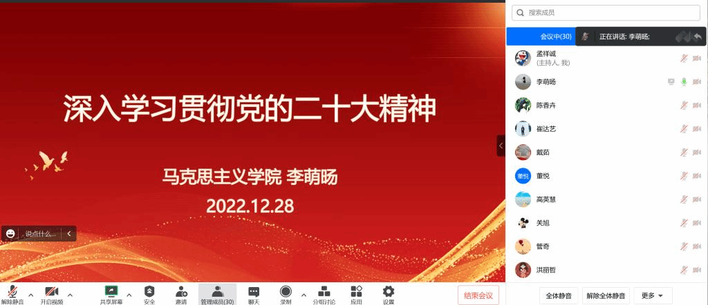 2022年12月28日,马克思主义学院党支部在董悦书记组织下以腾讯会议形式开展了12月份主题党日活动。主题党日活动通过讲党课方式开展,党支部组织委员李萌旸同志作为此次“党课开讲啦”活动主讲人,以深入学习贯彻党的二十大精神为主题,为全体党员全面深入解读了中国式现代化。中国共产党第二十次全国代表大会,是在全党全国各族人民迈上全面建设社会主义现代化国家新征程、向第二个百年奋斗目标进军的关键时刻召开的一次十分重...