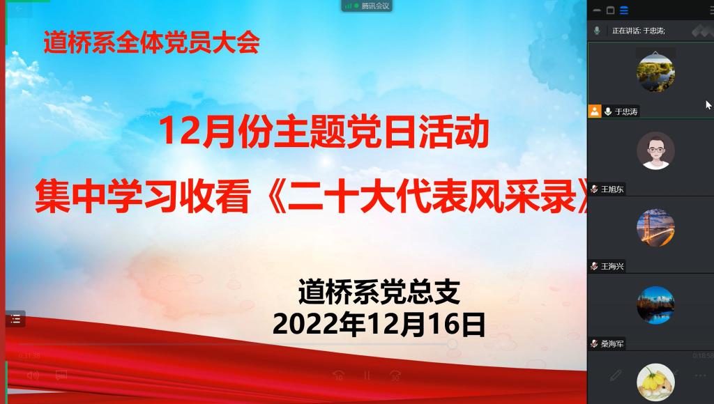 2022年12月16日,道桥系党总支组织全系党员以线上腾讯会议方式开展12月份主题党日活动,集中学习收看《二十大代表风采录》,本次主题党日活动由道桥系党总支书记于忠涛主持。电视系列片《二十大代表风采录》已在中央和地方新闻网络媒体、商业视频网站,以及全国高铁、部分城市地铁公交等全媒体推出。为充分展示新时代优秀党员代表先锋形象,进一步加大对二十大代表先进事迹的宣传力度,按照省委组织部、省委教育工委及校党委组...