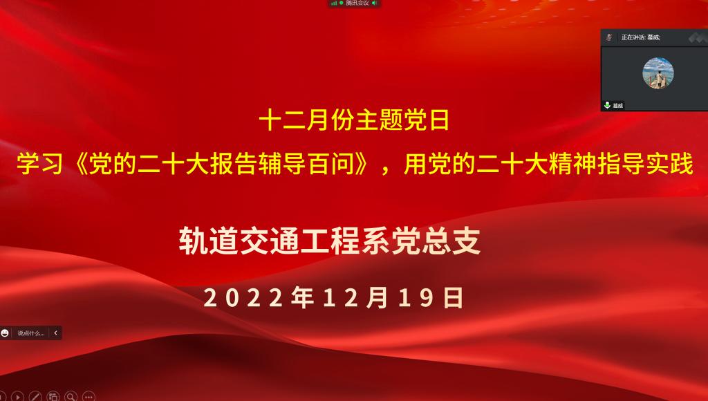 2022年12月19日下午14:00,轨道交通工程系党总支运用腾讯会议的方式组织开展了十二月份主题党日活动——“学习《党的二十大报告辅导百问》,用党的二十大精神指导实践”。本次活动由系党总支书记慕威主持,轨道交通工程系党总支全体党员参加。会议伊始,慕威书记宣读了本次主题党日主题——“学习《党的二十大报告辅导百问》,用党的二十大精神指导实践”。接下来,分别由总支书记慕威、教工支部书记刘继光、学生支部书记杨丽...