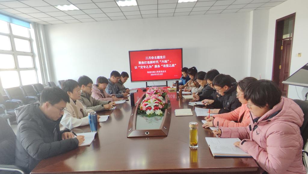 轨道交通工程系党总支于2024年3月13日开展主题为聚焦打造新时代“六地”,以“交专之为”服务“攻坚之战”的三月份主题党日活动。会议由党总支书记慕威主持,轨道交通工程系全体教工党员参加。首先,由孔繁军老师领学中国共产党辽宁省第十三届委员会第六次全体会议精神,省委十三届六次全会坚持以习近平新时代中国特色社会主义思想为指导,审议通过《中共辽宁省委关于深入贯彻落实习近平总书记在新时代推动东北全面振兴座谈会上...