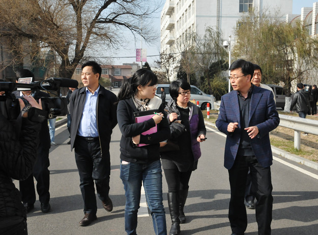 在道桥工程中心,张亚军校长向记者们介绍了我校公路工程试验检测中心、辽宁省桥梁安全工程技术研究中心在教学、科研、生产经营等方面取得的成绩,道桥系紧密跟踪生产一线、实施产学研一体化的发展模式。记者对正在进行水泥混凝土技术性质检验的道桥专业学生进行了现场采访。