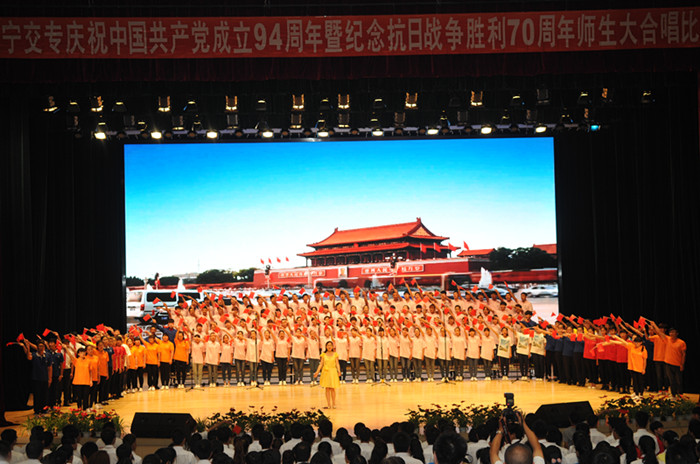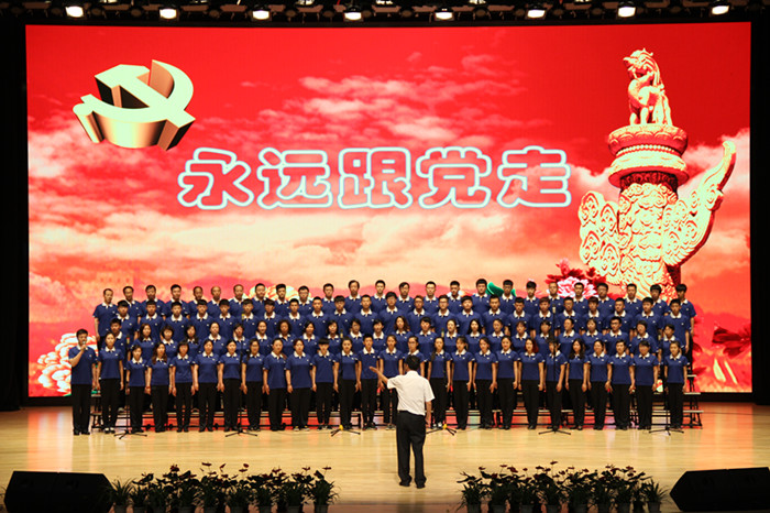 为纪念中国共产党建党94周年暨中国人民抗日战争胜利70周年,大力弘扬伟大的抗战精神,歌颂党的正确领导,充分展示我校师生热爱党、坚决拥护党的理想信念和积极进取、朝气蓬勃的精神面貌,更好地为学校发展建设凝心聚力,7月1日,由党委工作部、工会、团委共同承办的“永远跟党走” 纪念建党94周年暨抗日战争胜利70周年师生合唱比赛在学生素质教育中心礼堂隆重举行,全校师生近1500人参加了本次活动。