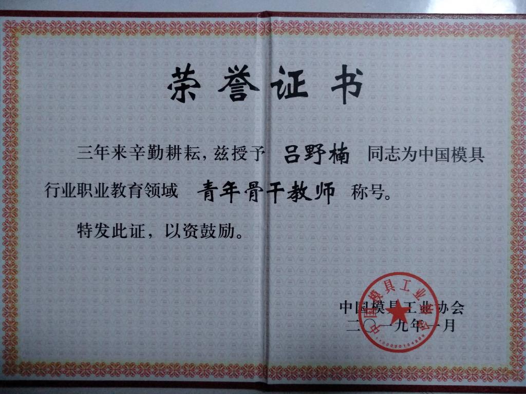 吕野楠老师获得中国模具行业职业教育领域青年骨干教师称号