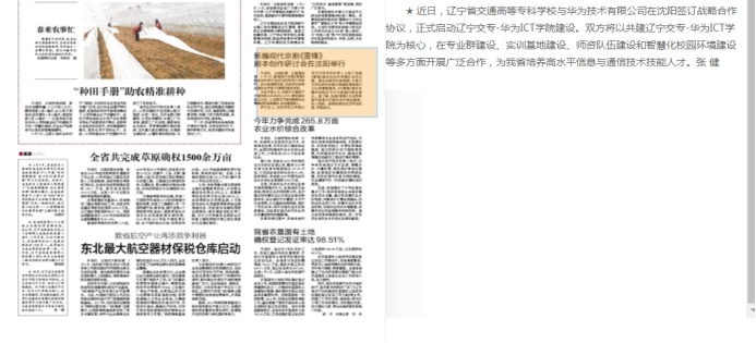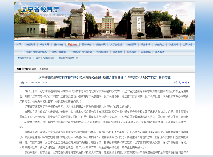 3月2日,我校与华为技术有限公司在辽宁友谊宾馆一号楼举行战略合作暨共建“辽宁交专-华为ICT学院”签约仪式,并受到社会各界广泛关注。辽宁电视台辽宁新闻栏目、辽宁日报、沈阳电视台沈阳新闻栏目、辽宁省教育厅官网、辽宁省工信厅官网等多家主流媒体报道了签约仪式。
