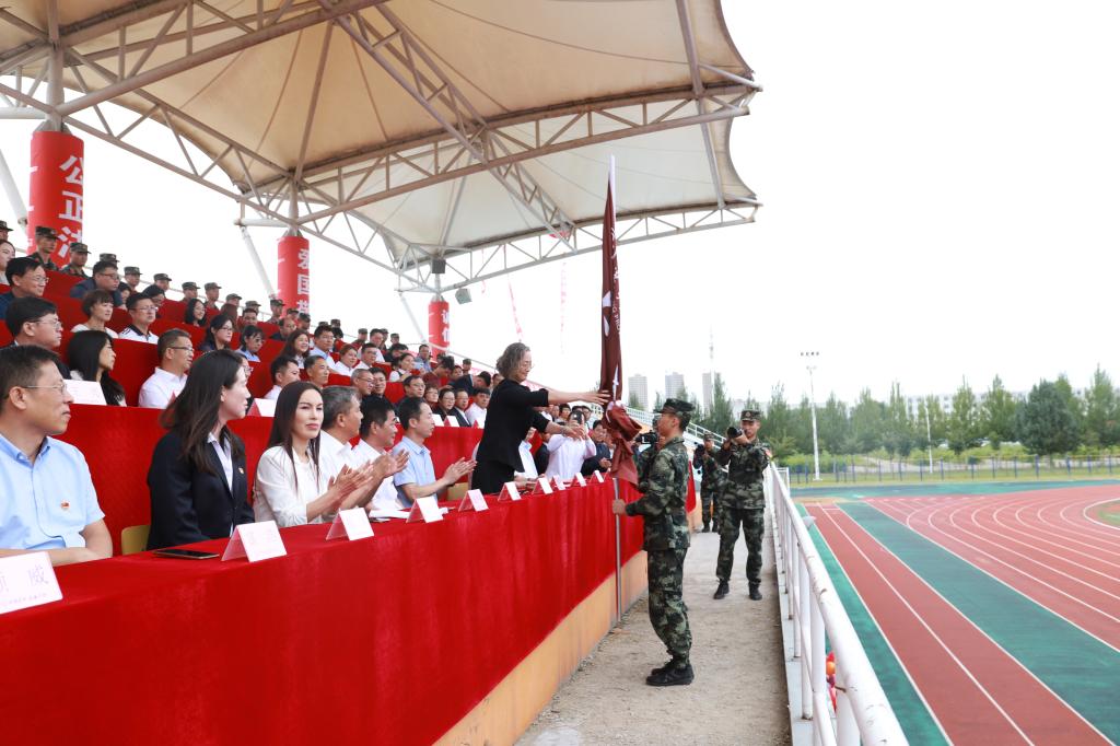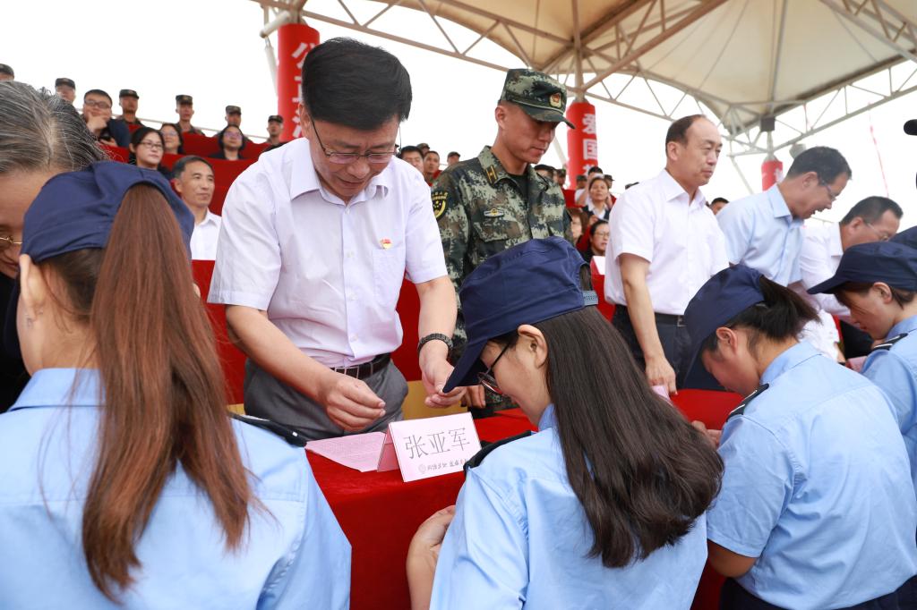 党委副书记岳贵鑫教授请学校领导为新生佩戴校徽,请副校长徐雅娜教授为参加军训的学生代表授大学生军训旗。
