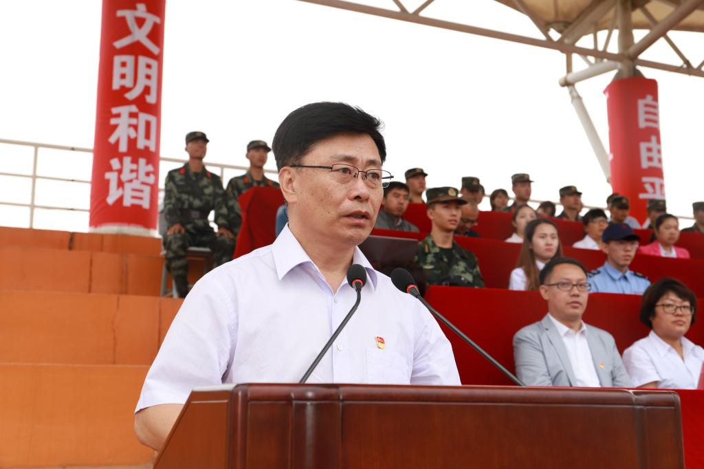 武警辽宁总队执勤支队张焰副大队长作军训动员讲话。他希望全体新生敢吃苦、守纪律、善学习和保安全,并表示全体军训教官将以一流的作风和一流的标准圆满完成新生军训任务。