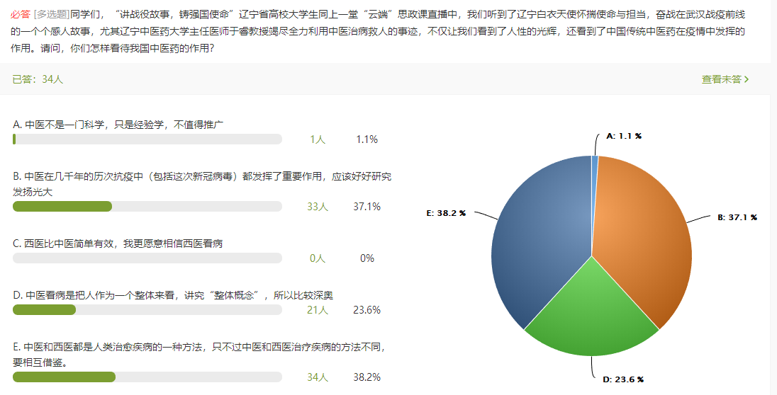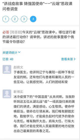 通过收看“云端”思政课,我校师生认为本次云端课堪称疫情期间思政教学发出的最强声音,拨动着每一名师生心底的琴弦,激发出莘莘学子强烈的爱国情怀和使命责任。突如其来的疫情是对国家的考验,更是对广大青年学生的一场历练。大学生要自觉用新时代中国特色社会主义思想武装头脑,用所学本领奉献社会,将个人命运和国家民族命运融为一体,为中华民族的伟大复兴奉献青春,实现人生价值。