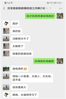 概论课、基础课、形势与政策课的老师分别从各自课程角度为学生设置在线讨论题目,学生积极踊跃参与发言。同学们在留言板中谈到了疫情中共产党的坚强领导,谈到了社会主义制度的优越性,并深切感受到四个自信不是书本上的理论,而是实实在在的身边事,是发自内心的深刻认同。好多同学表示“此生无悔入华夏,来世还在种花家”。