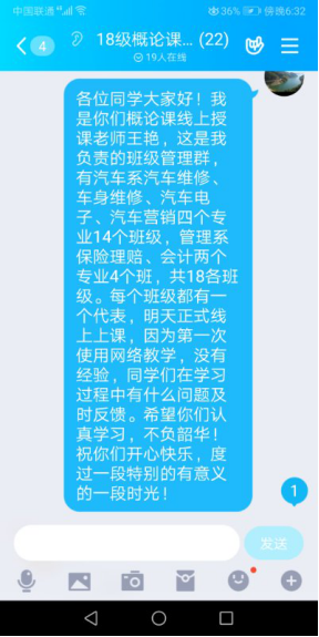 建立多种渠道联络方式,保证学习、交流信息的上通下达。每名教师组建QQ群,将名下班级负责人拉入群中,传达课程相关重要通知;网络平台上老师通过“通知”、消息等功能为学生发送学习信息,与学生在线互动;学生线上学习期间遇到的任何问题,老师通过平台和QQ群为学生及时解答。