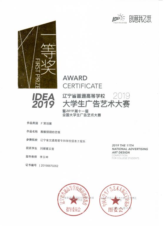 2019年11月25日,由辽宁省教育厅、辽宁省财政厅、辽宁省普通高等学校创新创业教育指导委员会共同主办,辽宁工业大学、鲁迅美术学院联合承办的2019年辽宁省普通高等学校大学生广告艺术大赛暨2019年第十一届全国大学生广告艺术大赛辽宁赛区颁奖典礼在辽宁工业大学举行。我校信息工程系广告设计与制作专业学生在李玉坤老师的指导下获得省赛一等奖1个,三等奖3个,优秀奖15个,取得该项赛事获奖等级和获奖数量的新突破。