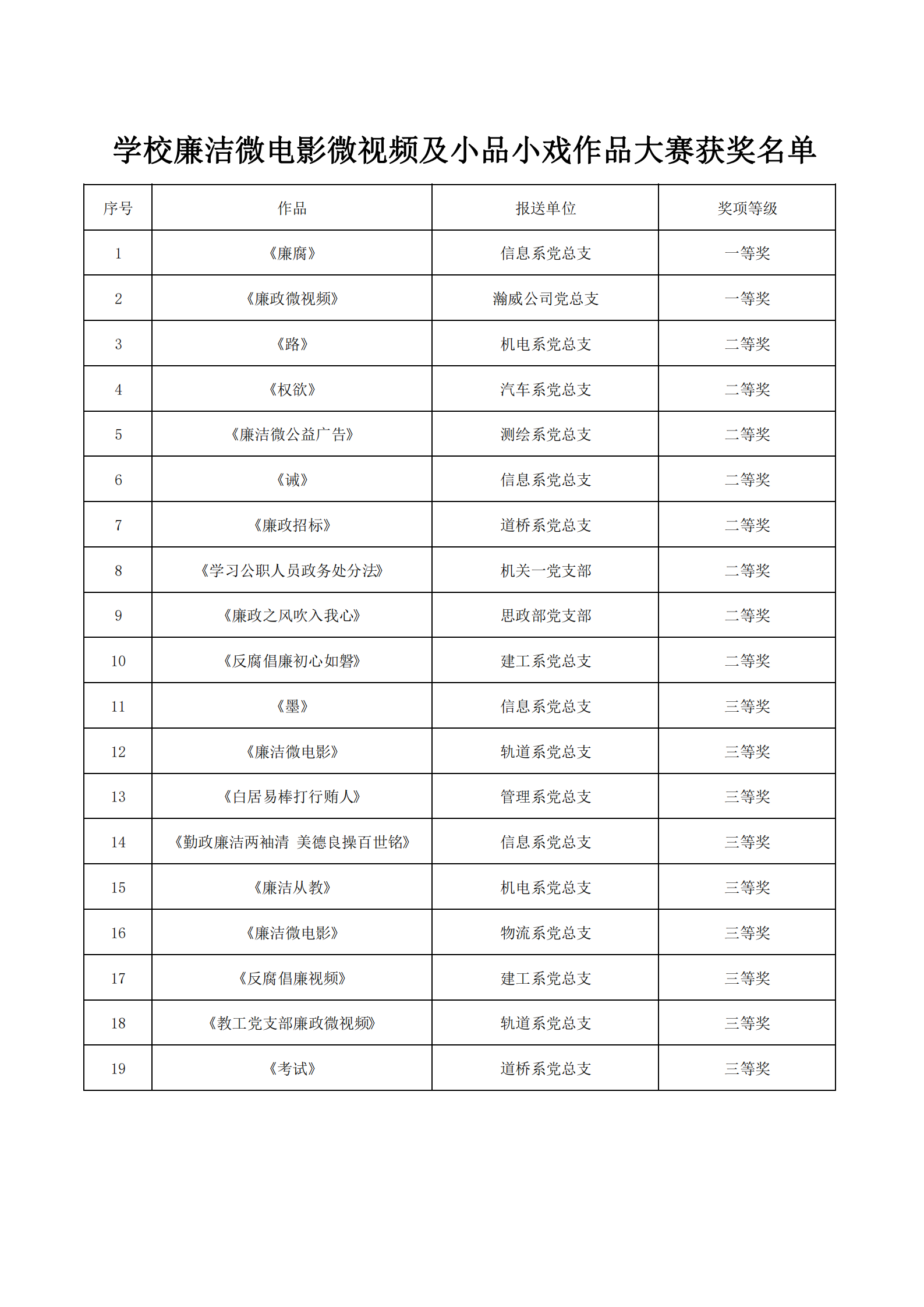 为贯彻落实学校全面从严治党工作会议精神,加强学校党风廉政建设,根据学校《关于举办廉洁微电影微视频及小品小戏作品大赛的通知》(辽交专纪发﹝2021﹞1号)要求,学校纪委在全校基层党组织中开展了廉洁微电影微视频及小品小戏作品征集评比活动。