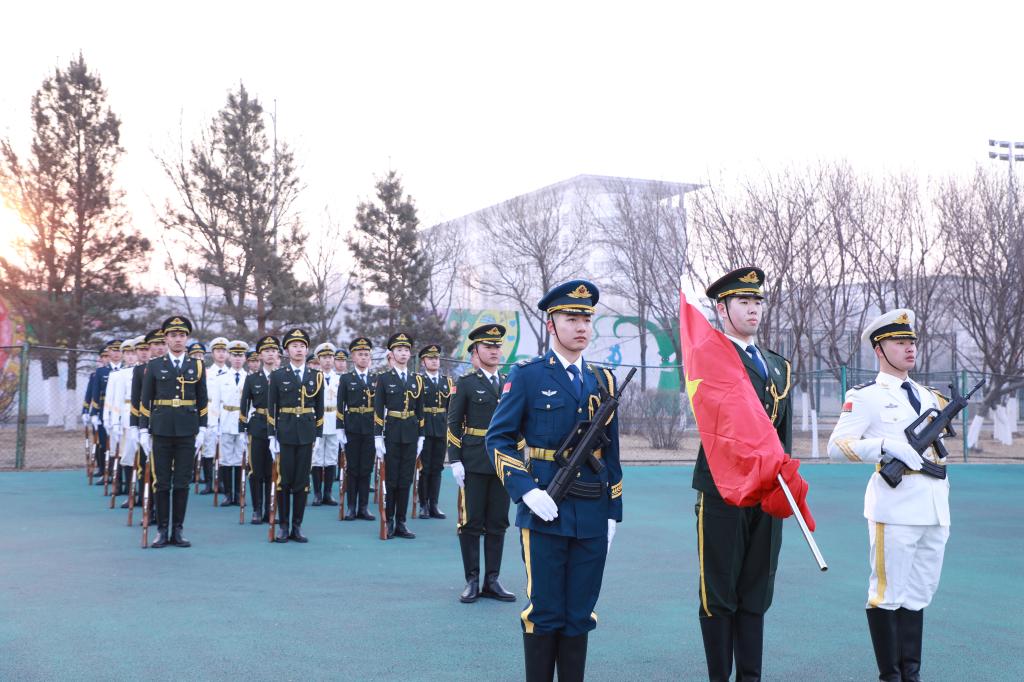 早上7点,英姿勃发,气宇轩昂的国旗护卫队护送五星红旗进场,伴随庄严的《义勇军进行曲》,五星红旗冉冉升起,全体师生齐唱国歌。