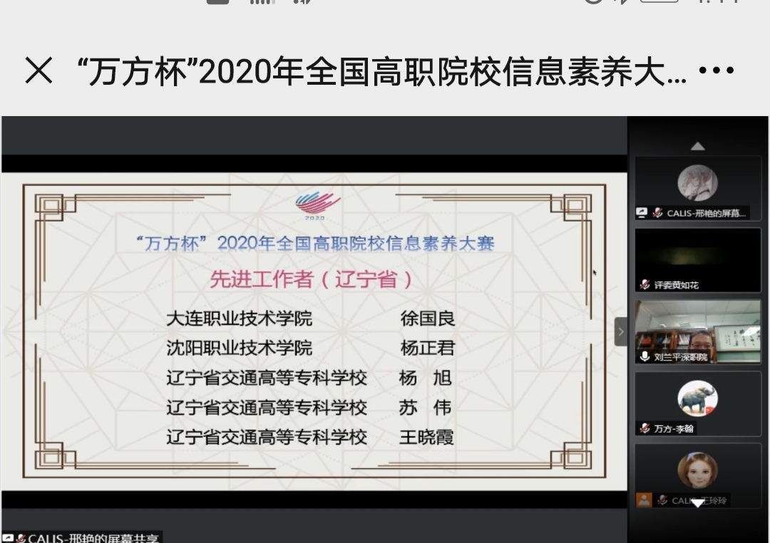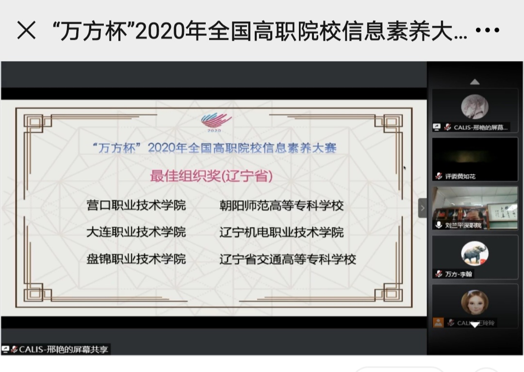 2020年9月-11月,我校图书馆首次成功承办了“万方杯”2020年全国高职院校信息素养大赛辽宁赛区赛事,得到了全省高职院校的积极响应和参与,现已圆满结束。我校被全国高职院校信息素养大赛国赛组委会评为“最佳组织奖”单位,我校杨旭、王晓霞、苏伟3名人员获得了大赛“先进工作者”称号,张妮妮老师和曹诗奇老师提交的微课在省赛中分获一等奖和三等奖,为我校争得了荣誉。