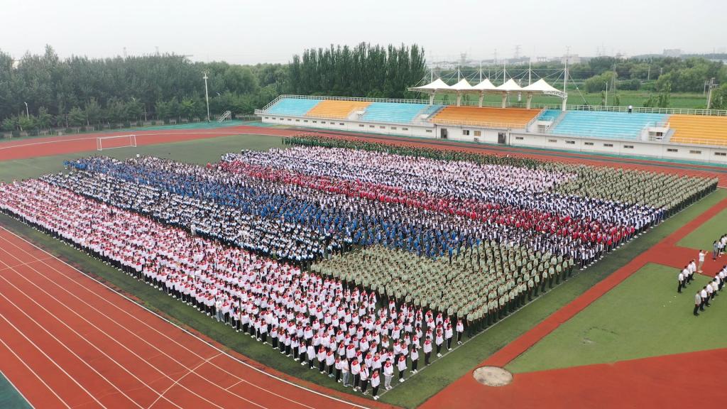 国旗护卫队身着戎装,迈着整齐的步伐,护送着五星红旗走向升旗台。全场师生怀着激动喜悦的心情,一同高唱国歌,注目凝望。在雄壮的国歌声中,五星红旗冉冉升起,迎风飘扬。