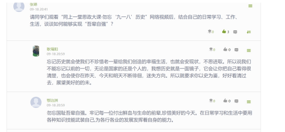 本次思政大课以沈阳“九·一八”历史博物馆中有代表性的展品、文物为载体,带领学生重温了那段东北人民浴血抗日的不屈岁月。课程的学习在师生中引起强烈反响和热议,思政部教师在课程结束后依托学习通平台设置了“勿忘‘九一八’”的相关讨论话题,各年级学生积极参与回帖,倾诉学习感受。学生们为中国人民,尤其是东北抗日联军在长达十四年的时间里于白山黑水间顽强抵抗日寇残暴侵略的精神所感动,大家纷纷留言表示要铭记历史,珍惜和平,在新时代继续传承弘扬伟大的抗战精神,坚定不移跟党走,在民族复兴的道路上奋勇前进。