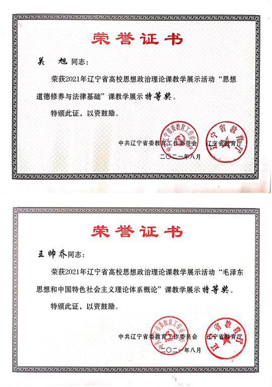 本届展示活动在全省高职高专院校中共评选出5个特等奖,其中关旭老师荣获“思想道德修养与法律基础”课教学展示特等奖,王帅乔老师荣获“毛泽东思想和中国特色社会主义理论体系概论”课教学展示特等奖。
