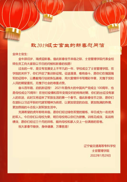 春节是我国最盛大、最热闹、最重要的一个古老传统节日。每逢这个节日,远在他乡的游子都会选择回家过年。但由于入伍集训,这是2019级士官生们第一个跟家人分别的春节。虽然因为疫情常态化管理学校老师没法到部队亲自慰问,但母校的老师、家乡的亲人,都无比的牵挂着你们。在春节即将到来之际,士官管理学院的领导、老师写致全体士官生一封新春慰问信。