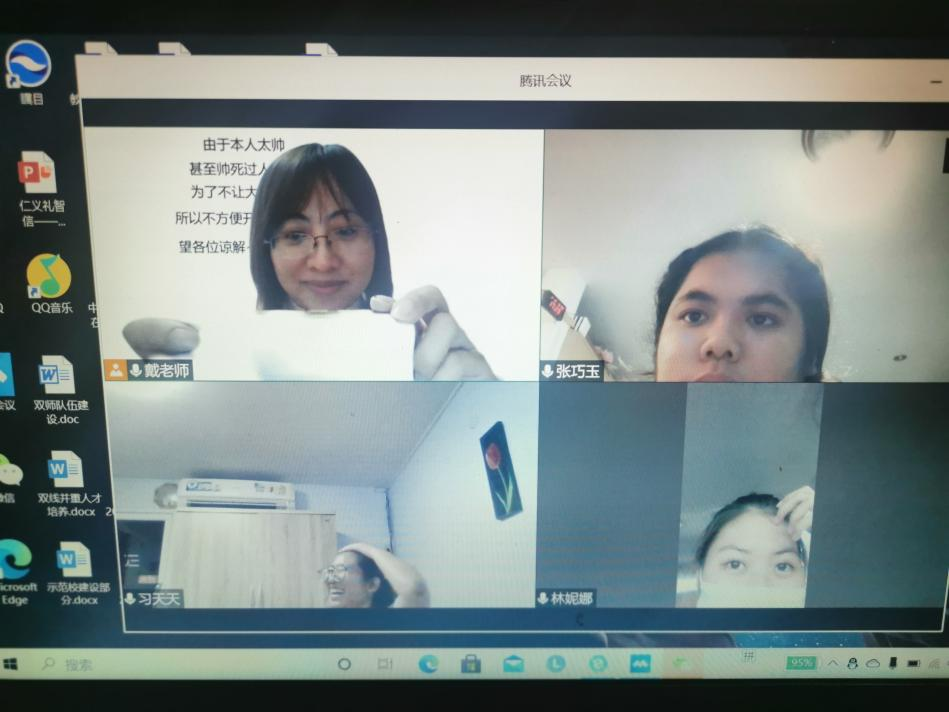 本学期,我校来华留学生线上教学如期开课,教学秩序井然。目前我校境内外在籍留学生共10人,分别为机电一体化技术、工业机器人技术、关务与外贸服务3个专业,其中境外留学生采用线上教学,在校留学生于3月14日校园封闭后开始转为线上教学。为了确保在线教学规范有序运行,外事处制定了《2022年春季学期留学生课程在线教学实施方案》,指导任课教师根据课程特点积极尝试不同的软件平台组织教学。通过超星学习通、微信群、腾讯会议等完成了课件上传、在线直播、课前签到、课上点名、教学互动、作业布置及批改等教学活动;通过提前上传学习资料督促学生自主学习;通过多样化在线教学形式提高学生的学习积极性及参与度,课堂教学互动氛围良好,教学运行整体顺利。线上教学实施以来,任课教师不断摸索、改进教学方法,境内外留学生积极配合参与,教学效果得到有效提升。同时,为了活跃在线学习的氛围,丰富留学生课余生活,学校还举办了以“我和中国有个约会”为主题的留学生系列竞赛活动,包括读书活动、演讲比赛、摄影比赛等。通过开展各种在线学习竞赛活动,增加学生学习乐趣,提高了留学生的汉语应用能力。