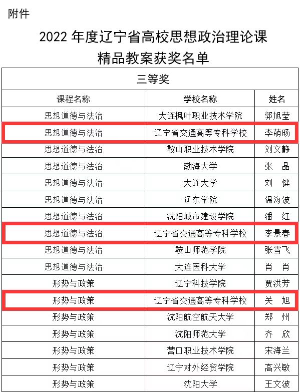 此次辽宁省“精品教案”评选活动是面向辽宁省百余所本专科院校思想政治理论课教师的赛事活动。根据《关于组织开展“2022年度辽宁省高校思想政治理论课创优计划”系列活动的通知》(辽委教通〔2022〕15号)要求,经部门初赛、学校推荐、专家评审,李萌旸老师、关旭老师、李景春老师代表我校分别荣获《思想道德与法治》和《形势与政策》“精品教案”三等奖。