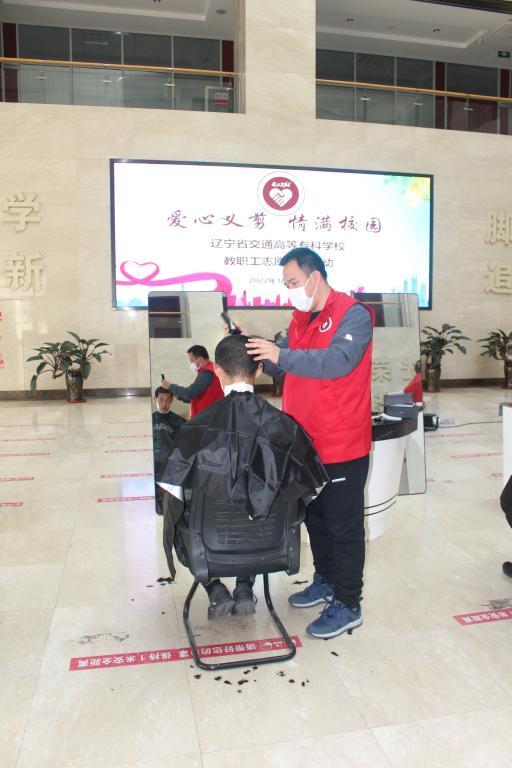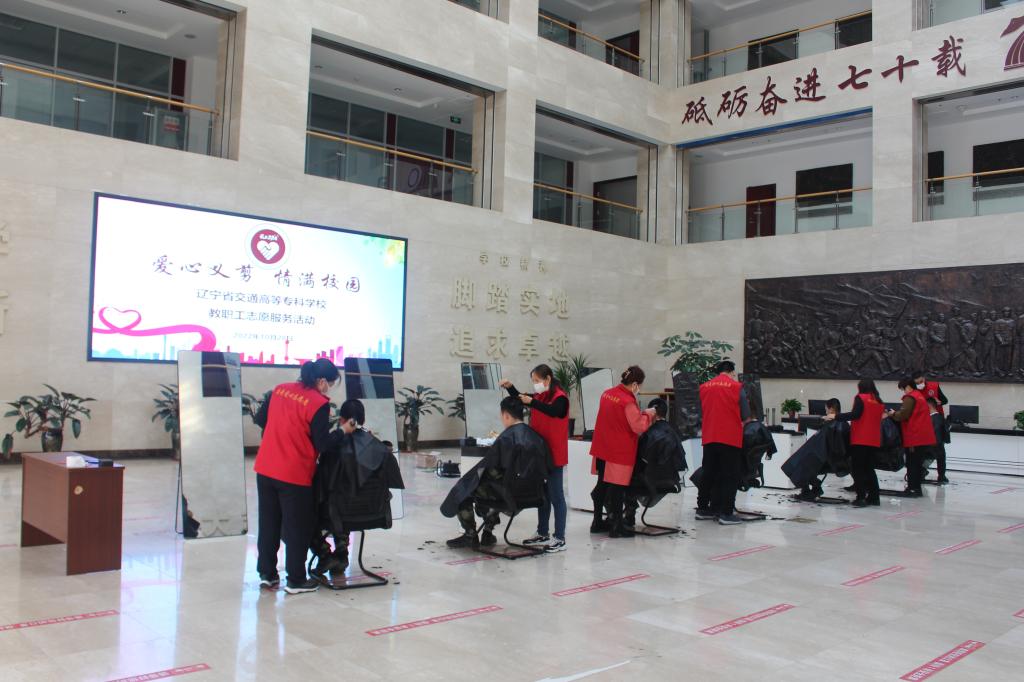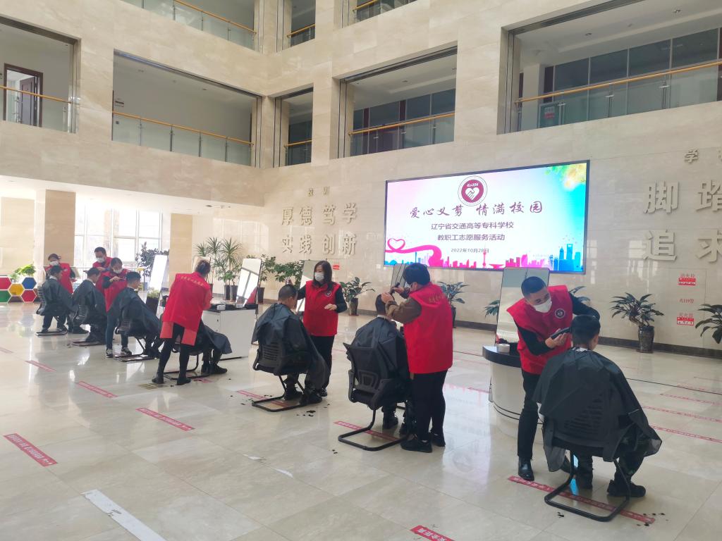 2022年10月28日下午,我校工会在学生素质教育中心一楼大厅组织开展了“爱心义剪 情满校园教职工义务理发志愿服务活动,为士官班的同学们义务理发。