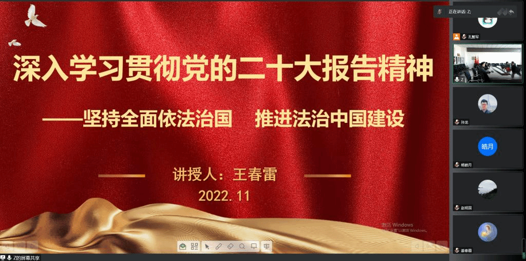 1126日,为进一步学习宣传贯彻党的二十大精神,进一步引导广大党员加强对党的二十大精神的学习,王春雷副校长在A712会议室,通过线上与线下相结合的方式,为轨道交通工程系党总支的全体教工党员上题目为《深入学习贯彻党的二十大报告精神—坚持全面依法治国、推进法治中国建设》的党课。