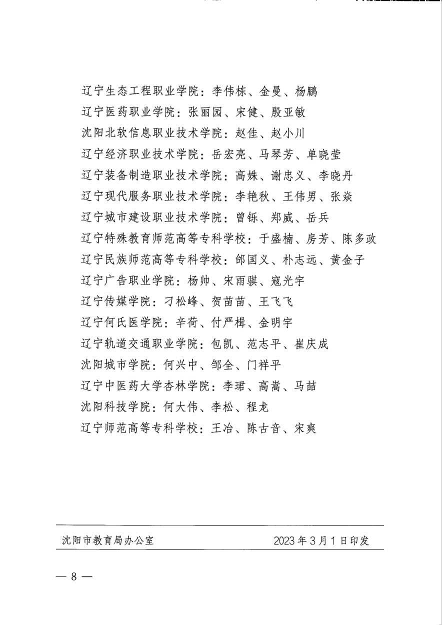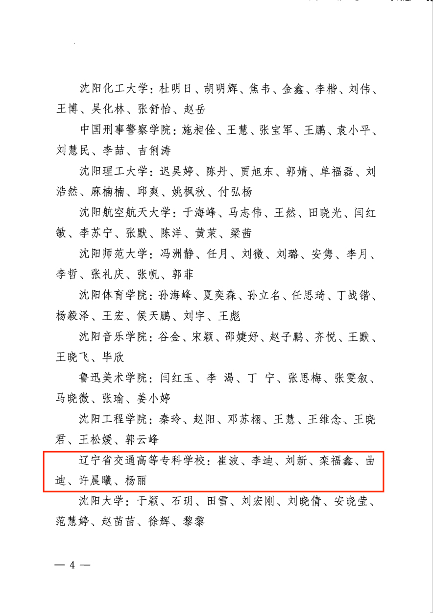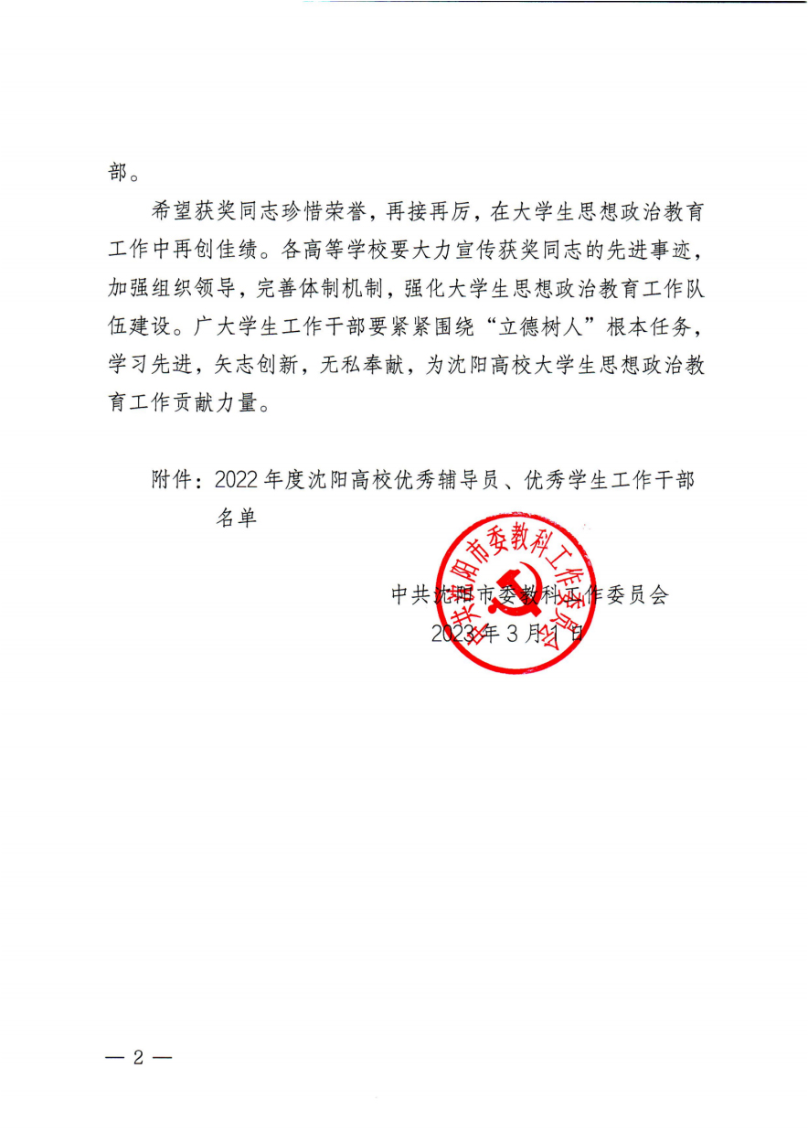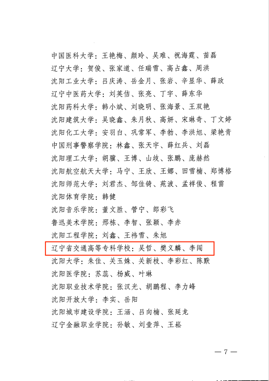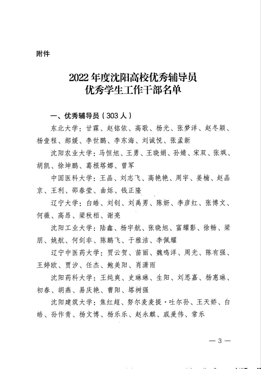 近日,由中共沈阳市委教科工作委员会组织开展的2022年度沈阳高校优秀辅导员和优秀学生工作干部评选活动结果揭晓,我校汽车工程系崔波同志、物流管理系李迪同志、信息工程系刘新同志、机械电子工程系栾福鑫同志、建筑工程系曲迪同志、管理工程系许晨曦同志、轨道交通工程系杨丽同志荣获“2022年度沈阳高校优秀辅导员”称号,学生工作处副处长李闯同志、机械电子工程系党总支副书记吴哲同志、建筑工程系党总支副书记樊义麟同志荣获“2022年度沈阳高校优秀学生工作干部”称号。