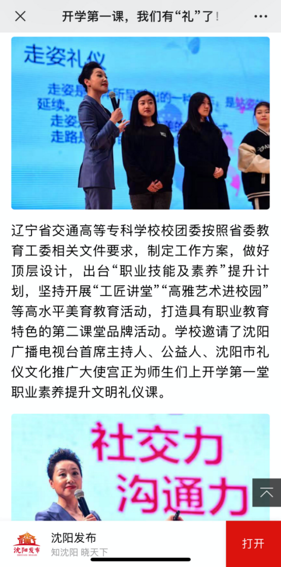 按照中共辽宁省委教育工委、辽宁省教育厅关于组织全省高校上好2023年春季学期“开学第一课”的文件要求,3月8日14:00时,校团委在学生素质教育中心礼堂举行我们有“礼”了——第一堂职业素养提升文明礼仪课。沈阳广播电视台首席主持人、沈阳市文史研究馆研究员、全国三八红旗手、2021中国好人宫正进行现场授课。校团委全体人员、各系团总支书记、各系教师代表及各系学生代表共计一千余名师生出席活动。仪式由校团委干事贾晨阳主持。