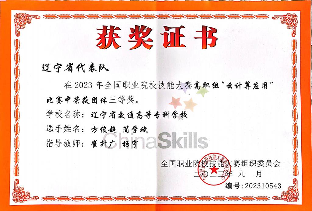 9月20-21日,2023年全国职业院校技能大赛高职组“云计算应用”赛项在长春汽车工业高等专科学校举行。本次“云计算应用”赛项共有来自全国60所职业院校的120名参赛选手同台竞技。由崔升广、杨宇老师指导,方俊超、简学斌同学参赛的辽宁省代表队获得团体三等奖(全国总成绩第21名)。