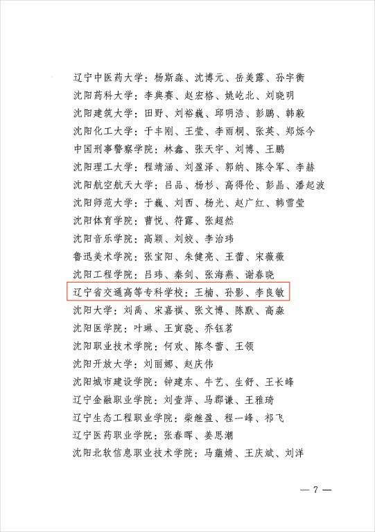 近日,由中共沈阳市委教科工作委员会组织开展的2023年度沈阳高校优秀辅导员和优秀学生工作干部评选活动结果揭晓,我校汽车工程系樊亚明同志、建筑工程系揭丹同志、信息工程系李正伟同志、物流工程系王庆伟同志、测绘工程系王伟冬同志、机电工程系张晓婷同志荣获“2023年度沈阳高校优秀辅导员”称号,学生工作处处长王楠同志、汽车工程系党总支副书记孙影同志、心理健康教研室主任李良敏同志荣获“2023年度沈阳高校优秀学生工作干部”称号。