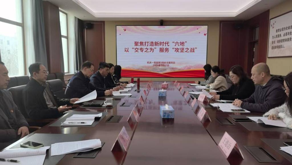 2024年3月27日下午,机关一党支部在综合办公楼301会议室以“聚焦打造新时代‘六地’ 以‘交专之为’服务‘攻坚之战’”为题开展3月份主题党日活动。学校党委书记任冰参加主题党日活动。本次活动由机关一党支部书记周媛媛主持。